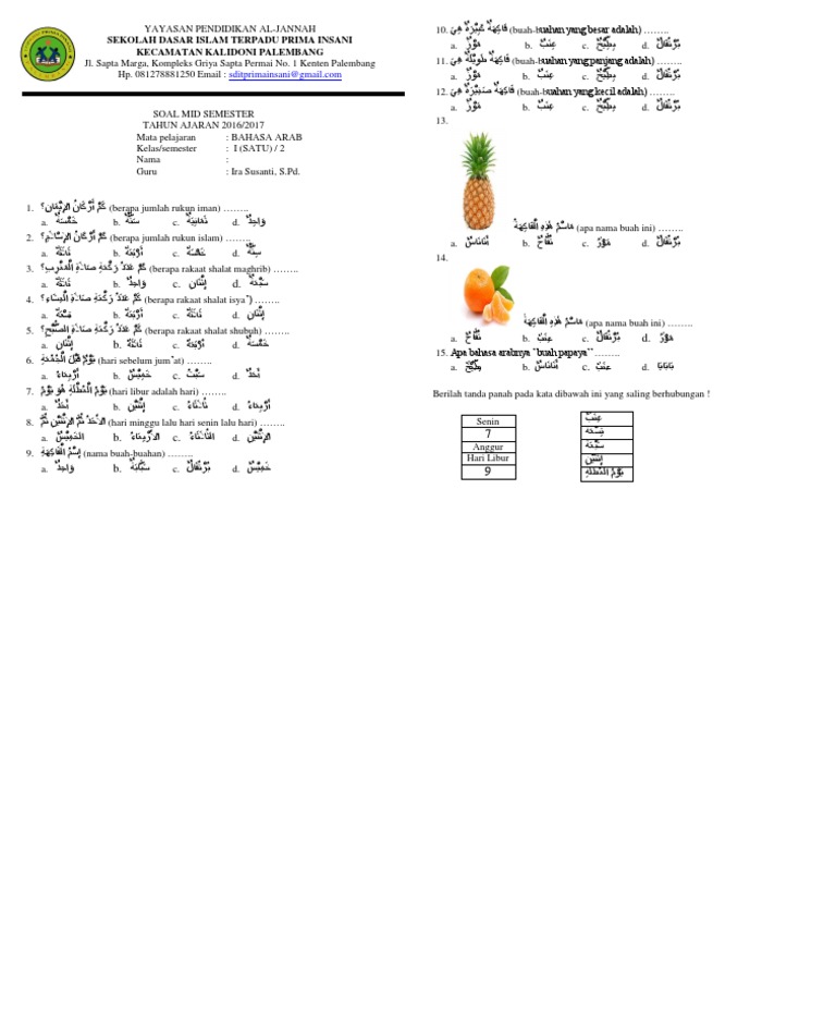 Daftar kd dalam soal pas bahasa arab kelas 1 mi, meliputi: Baiklah, berikut adalah contoh soal ujian bahasa arab kelas 2 mi semester 2 lengkap dengan kunci jawaban dan pembahasan soal. 1 ulangan akhir semester a. Kerjakan dulu soal yang kamu anggap mudah. Soal ulangan bahasa arab kelas 2 mi. Dan jika dirasa bermanfaat silahkan dibagikan lagi lewat jejaring sosial seperti facebook, twitter atau lainnya seperti tombol dibawah. Nah demikianlah rangkaian soal latihan uts b. Ulangan akhir semester (uas) ganjil tahun pelajaran 2015/2016 sd it sabilul huda kota cirebon.!. Soal pat bahasa arab kelas 1 dan jawaban tahun 2021. Berilah tanda silang (x) pada jawaban yang benar! Soal ujian bahasa arab mi kelas 2 semester 2 beserta kunci jawabannya. Materi bab 6 bahasa arab mi kelas 2 semester genap kma 183 tahun 2019 label. Soal uts bahasa arab kelas 2 semester 1_mi.